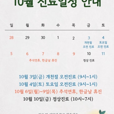 안녕하세요 관평동 경희가족한의원입니다 10월 진료일정 안내드립니다 10월 3일(금) 개천절 오전진료 (9시~1시) 10월 4일(토) 토요일 오전진료 (9시~1시) 10월 6일(월)~9일(목) 추석연휴, 한글날 휴진 10월 10일(금) 정상진료 (10시~7시) 진료 및 예약에 참고 해주세요 풍성한 한가위 보내세요 ^^ 관평동 경희가족한의원 문의 및 진료예약 ...